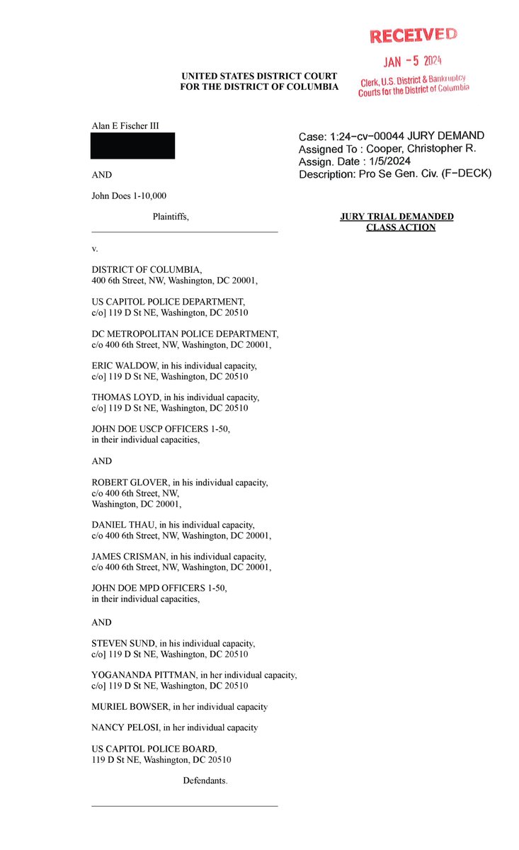 A class action civil rights lawsuit has been filed against the US Capitol Police, DC Metropolitan Police, Mayor Bowser, and Nancy Pelosi for the planned security failures and the illegal assault on early January 6th West Plaza protesters that led to the J6 riot.